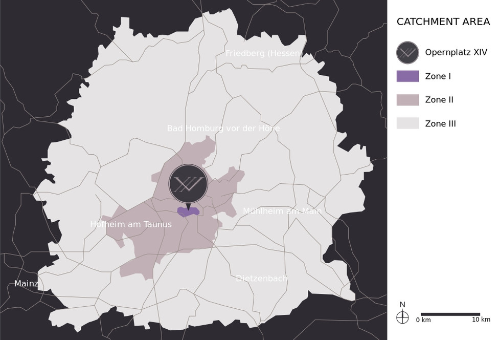 Das Einzugsgebiet des Opernplatz XIV entspricht dem Einzugsgebiet der Frankfurter Innenstadt und kann in drei Zonen unterteilt werden. Allein in Zone 1, dem Kerneinzugsgebiet des Opernplatzes, mit den Postleitzahlen 60313, 60306 und 60325 sind knapp 14.000 Einwohner gemeldet.